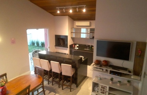 Beautiful house, comfortable, modern, airy, with air conditioning in the living room and all bedrooms. It has 3 double bedrooms, 1 suite with king-size bed, closet and cable TV. 1 bedroom with queen bed. 1 bedroom with double bed and single bed. Gourmet space with internal barbecue, integrating sale and kitchen. Fully equipped kitchen, duplex refrigerator, stove and oven, microwave. Living room and tv. Cable TV in the room.