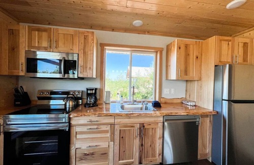 Island Overlook #3 is set the furthest backofthree separate, identical cabins situated on a hillside overlooking Lake Superior. These newly constructed cabins feature all of the comforts of home while boasting an unforgettable view of the Apostle Islands National Lakeshore, particularly Raspberry Island. In each cabin, you’ll walk into an open-concept living room and kitchen with panoramic windows and a sliding glass door to the private back patio. The living space is equipped with a Roku Smart TV and DVD player, as well as a queen sleeper sofa. Enjoy the view from the fully-stocked, modern kitchen. The cozy, quiet bedroom features a queen bed and modern ceiling fan/light combo. The spacious bathroom has a large walk-in shower! Head outside to utilize your cabin’s private patio furniture, grill, and fire pit. *Guests may use outdoor fire pit but are required to purchase their own firewood locally.* All linens, towels, and basic toiletries provided. Beach towels NOT provided. Kitchen stocked with essential cooking equipment and standard drip coffee maker.
