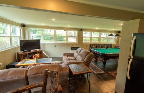 Inside, wood floors, exposed beams, and a gas fireplace with stone surround create a warm lodge-like vibe. Spread out between a living room and the game room where you can concoct a crisp drink at the bar, play a round of pool, or unwind on sofas and watch TV, equipped with DISH.