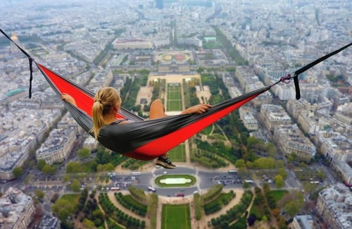 A fully equipped kitchen is located under the staircase, and it leads to an additional bedroom with windows that are cut into the angled walls and ceilings, giving a lovely view over the rooftops of Paris. There is an elevator in the building, but you’ll need to climb one flight of steps to reach the apartment.