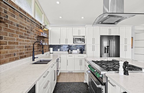 The modern kitchen is designed for both style and functionality, a chef’s dream! Featuring sleek white cabinetry, a striking brick accent wall, and a spacious marble island with seating for five. High-end appliances include a wine fridge, an extra refrigerator, a large American Range Bluestar 6 burners and oven, a dishwasher, microwave, toaster, coffee maker, and French-door refrigerator with a water dispenser. Floating shelves with accent lighting add warmth and character to the space.