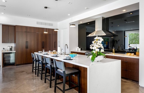 The expansive open-concept floor plan makes it easy for your entire group to relax and reconnect. Walls of glass slide away to blur the line between indoors and outdoors in true Palm Springs style, creating a seamless flow from the chic living spaces to the private resort-style backyard. Beds: K,K + Bonus Sleeping Area