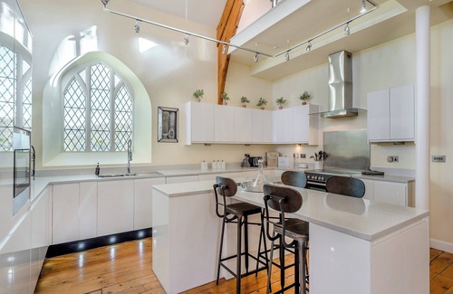 Bedroom 4: Galleried, Kingsize (5ft) Bed Ensuite: Walk-In Shower, Toilet. Oil central heating, electricity, bed linen, towels and Wi-Fi included. Cot, highchair and stairgate. Welcome pack.. Back garden with patio and garden furniture. Private parking for 4 cars. No smoking.. The moment you approach this beautifully converted chapel you know you’re in store for a lovely stay in a unique property. The large wooden chapel doors open to reveal a big hallway with a couple of rooms leading off to the sides. You come to a useful study room first which offers a little privacy or peace, and the opposite is a utility room providing the perfect place to dry and feed the dog, dry wet coats after a busy day’s walking in the Lakes. A second set of doors opens into an impressive, Instagram-worthy living space, with high vaulted ceilings, large leaded windows, and oak beams. Once you catch your breath, you can take in the large kitchen with all the amenities and space required to cater anything from a simple sandwich to a family feast.