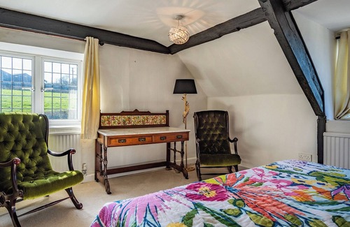 Bathroom: With spa bath, double shower cubicle and toilet. . Oil central heating, electricity, bed linen and towels included. Initial fuel for wood burner included. Highchair and stairgates available on request. Welcome pack. Enclosed garden with patio, garden furniture and barbecue. Private parking for 2 cars, No smoking. Please note: There is a fenced pond and small waterfall in the garden.. This 14th-century farmhouse is the perfect country get-away, with period and heritage features throughout. Set in an idyllic location next to the owner’s home on a 140-tree walnut plantation, with stunning views of the countryside and farm, with walnut trees surrounding the property. It is great for families, couples or small groups looking for a relaxing rural getaway. The Farmhouse is very historic and is estimated to have been built at or before the late 14th century. It is said the owner travelled and fought at the Battle of Agincourt. There are rumours of underground tunnels leading to another farm at the bottom of the valley, constructed for an escape in the frequent times of danger in the Welsh/English borderlands.