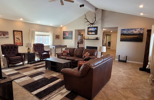 Welcome to the Meeteetse Retreat and the West! This gorgeous 4 bedroom 2.5 bath home is located in Meeteetse, Wyoming , near Cody and Yellowstone. Located right in town on the river this home is perfect for family gatherings or just a trip to our beautiful area. Once you walk in the home you are greeted with tall ceilings and lots of space. The gorgeous dining room is perfect for all your meals, while the living area is large enough to enjoy time together and playing games. Off the living room is a bunk room with multiple sets of bunk beds. Across the living room to the other side you will find a full bathroom with a beautiful step in tile shower as well as another bedroom with a king bed. The large kitchen provides ample space for food prepping and cooking. Off the kitchen and dining room you will find the Master bedroom. This large bedroom with a king bed not only has patio doors, it has an attached bath with a soaking tub and large walk in shower with dual heads. Down the hall from the kitchen is another small room with a bunk bed, a half bath, laundry room, access to the garage and arcade room. Guests can park in the 3 car garage or there is plenty of room outside. Once outside you will find a large backyard area for lawn games and a BBQ. As you continue around the corner you will see a fire pit with outdoor seating over looking the river right off of the arcade room. The arcade room has a fold out Murphy bed, air hockey table and entertainment area as well.