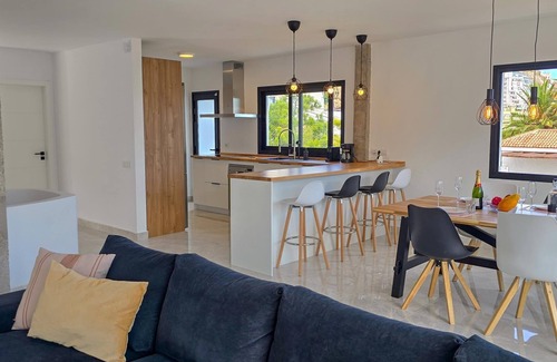The Space Let yourself be captivated by this stunning contemporary design villa with a private heated pool, located in the exclusive area of Tabaiba Baja. A perfect getaway where luxury, comfort, and tranquillity come together to offer you a truly unforgettable holiday. With capacity for up to 10 guests, this modern three-story villa features spacious, bright interiors, tastefully decorated with an elegant and sophisticated style. It also offers high-speed internet throughout the house, ideal for both leisure and remote work. On the top floor, you’ll find an open-concept kitchen, fully equipped and integrated with a large living-dining area. From here, you can access a terrace with spectacular sea views—perfect for enjoying breakfast at sunrise or a glass of wine at sunset.The middle floor houses two comfortable bedrooms: a master bedroom with a double bed, walk-in closet, and en-suite bathroom, and another bedroom with three single beds. This level also features a second, spacious and modern full bathroom. On the lower floor, you’ll enjoy a secondary kitchen connected to a living-dining area with direct access to the pool area. There are also two additional bedrooms: one very spacious with a double bed and a daybed—ideal for accommodating up to 3 guests—and another bedroom with a double bed. This floor includes a third full bathroom. Outdoors, a spectacular private heated pool with a waterfall awaits you, surrounded by gardens, sun loungers, and cosy corners designed for relaxation. There is also an outdoor toilet for added convenience during sunny days. The villa also includes a large private garage and is located in a very quiet area—perfect for unwinding or working remotely in a peaceful, comfortable environment.