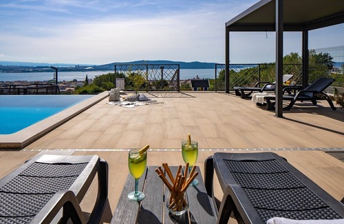 * The outdoor area offers exclusively for you a heated private 6m x 6m swimming pool with hydro-massage, 8 sun deck chairs, a covered outdoor dining area with amazing views of the surroundings and the sea, a lounge corner, a gas barbecue, an outdoor shower, a slide and a swing for your youngest. The evenings here are spectacular, enjoying a glass of wine overviewing the sunset and the town's Split lights.