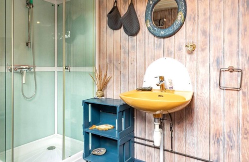 Layout: Kitchen(double folding bed, cooker(2 ring stoves), coffee machine, oven, fridge(+ freezer)), bedroom(double bed, 2x bunk bed), bathroom(washbasin, shower, toilet), freezer(60-99L), heating(electric), terrace, garden furniture, BBQ, fish cleaning table