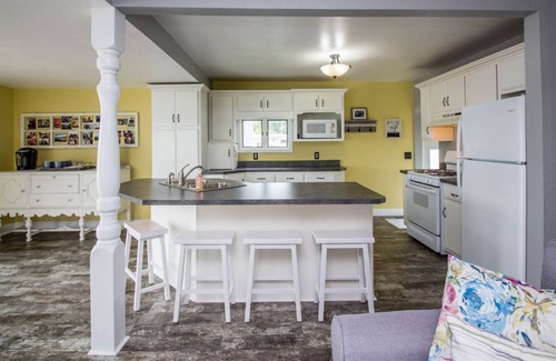 The original part of the house was built in 1930 so there are a few quirks. It is not wheelchair accessible as it is a tri-level without bedrooms on the main floor. On the main floor is the kitchen, living, dining, laundry & full bathroom. Go up for the master bedroom & bath. Go down a few stairs for the other 2 bedrooms which are partially underground but they do have windows. Then go back up to the main level towards the back of the house for our "bonus" room and 1/2 bath. The bonus room does have a small living room space with TV or it can be used as additional sleeping space as the couch will convert to a bed & become a semi-private space with the 1/2 bath. The bonus room area will not be usable space in the winter as this is where our outdoor furniture is stored. There is an unfinished basement that can be used in the case of storms (tornado).