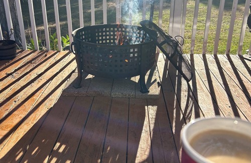 Relax with your morning coffee on the back deck by the little fire pit and the large family fire pit in the evening!