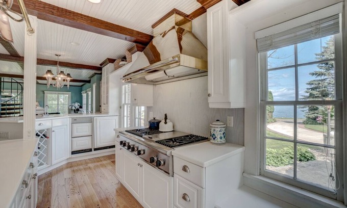 A STUNNING LAKEFRONT VACATION WITH GREAT GATHERING SPACES — Ideal for family & friends. Stay includes the entire historic stone house plus main level of Carriage House. 2 acres of lush gardens, 400’ of magnificent/ private lakeshore and patios. Full access to property amenities. Sleeps ten.