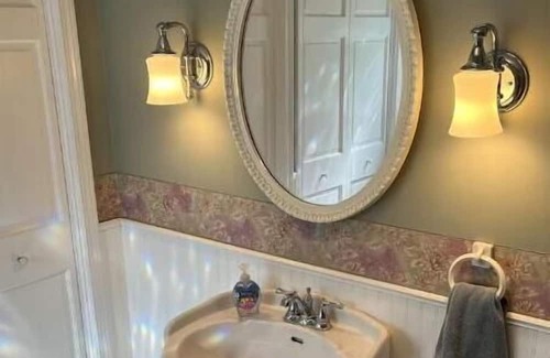 The upstairs bathroom has a combination bathtub and shower. The downstairs bathroom has a clawfoot tub which is good for a relaxing bath, but no shower.