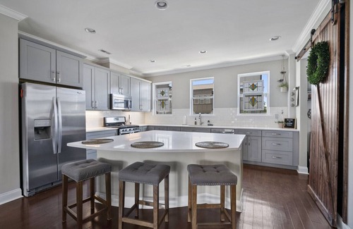 Our home is a 2400 sq. ft. three story townhome located the North End of Charlotte. It has 4 bedrooms, 3.5 baths, and 6 beds. There is plenty of space for rest, entertainment, and memories. The exceptionally large kitchen is stocked with all the cooking supplies you might need. Additionally, our bar is just waiting to chill your favorite beverage. To get a feel for how close you are to the city, just take a step out onto the balcony for quick glimpse of some of Charlotte's favorite buildings.