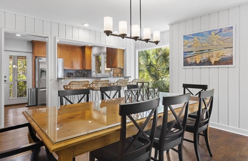 Discover Pelican's Perch, a 4-bedroom, 3.5-bathroom 4th-row beach home in Sea Pines, Hilton Head. Just 800 feet from the beach, this upside-down coastal retreat offers a private heated pool, screened-in porch, and spacious living areas. With an elevated treehouse-like ambiance, this home blends classic beach house charm with modern amenities—perfect for families and groups seeking relaxation and fun.