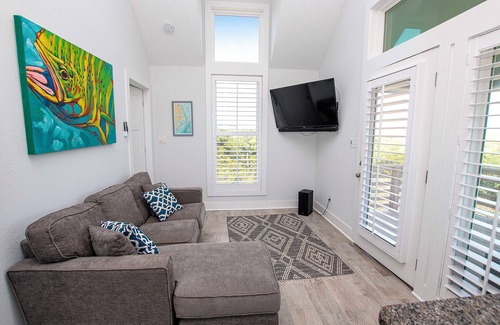 Top Level: Great Room with flat-screen TV and covered deck access, kitchen with a Keurig coffee maker and counter seating for 2, compact stove and refrigerator. Queen Master Bedroom with flat-screen TV and private bathroom.