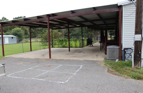 This cabin is located inside the Gavel Falls Campground and RV Park, which is part of the Lawler Auction Facility north of Shreveport, Louisiana. This property is ideal for entertaining large families and guests. Inside the home are 5 bedrooms and 3 bathrooms. This home was just updated in October 2018 with new granite kitchen counters, new appliances, new carpet, and many other amenities. The home has a 2-car covered carport and a covered patio that extends the entire length of the home. We have placed two concrete picnic tables and a large grill on the patio for outside cookouts and get-togethers. We also furnished the home with brand new furniture throughout. This property includes a large smart TV in the living room. This home was originally a huge manufactured home that the owners lived in before building a large log home. They converted it to a cabin in 2018, updating the kitchen with granite, new carpet throughout the home, and new fixtures throughout. New furniture was purchased for the home in 2018. This spacious home is ideal for large families and great for entertaining guests.