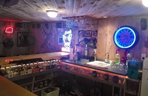 Large 5BR / 2.5BA home with plenty of space, open kitchen and dining areas, upper and lower living rooms, commercial style tavern room with bar, and a huge deck and patio for outdoor entertaining, complete with fire pit and gas and charcoal BBQ's. Located directly on the lake, on a dead end street, not on the main road as most Sacandaga homes are. Only 30 minutes from Saratoga Springs, Lake George, Six Flags Great Escape, West Mountain Ski Area, and the Lake George Outlets. Large U-shaped dock, deep water, bring your boat, canoes, rowboats, etc. Fish, bike, hike, swim, ski, sightsee, and much more. Quiet yet convenient location. Supermarkets, gas stations, white water rafting, tubing, restaurants, and much more within a 7-10 mile range. Main level: Very open floor plan, modern eat in kitchen, fully equipped with dishwasher, oven/stove, microwave, fridge/freezer, a half bath with laundry - washer and dryer use included, just bring your detergent. A large dining room, sunken living room, huge master bedroom with king size bed, the guest bedroom with a twin over full size bunk, full bath with shower. The lower level includes a second living room, tavern room with wet bar, bose audio system, and plenty of neon lights all around. There is a full bath with a shower over tub and three bedrooms. One is great for families with small children with a queen bed, twin bed, and a crib. The other two bedrooms have double beds in each. There is a daybed with a pullout trundle underneath in the main living room bringing the total bed capacity to 14.