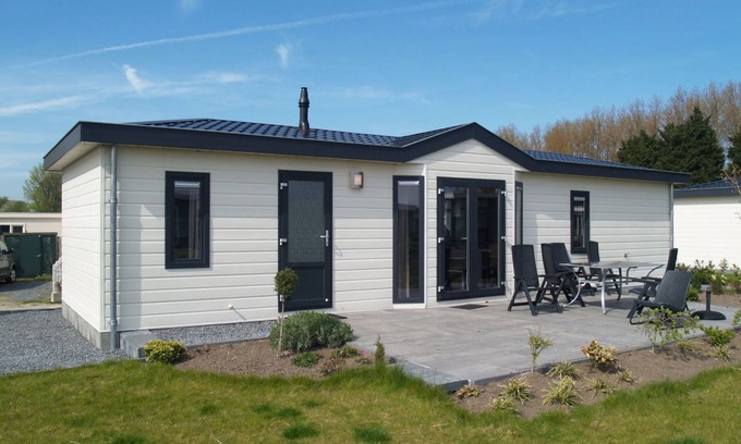 The Velthorst 6 is a 4-room chalet with a comfortable furnishing, spanning an area of 50 square meters. It features an entrance hall, a living/dining room with a dining table and a flat-screen TV, and three double bedrooms, each equipped with two beds. The open kitchen is well-appointed, offering four hot plates, a dishwasher, an electric coffee machine, and a combination microwave.