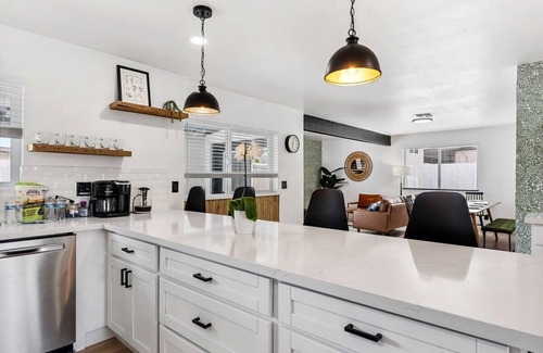 Bask in AZ luxury at this captivating retreat! Relax by the private pool, delight in the game room with arcade games & foosball, or unwind at the propane firepit. Choose from a separate casita w/king bed, master suite w/king bed & 55 smart TV, or 3 other cozy bedrooms boasting two queens and a full/twin combo. Enjoy 2 full kitchens, BBQ grill, tiki bar & pool lounge chairs. Ideal for families or groups, the prime location offers proximity to local attractions. Make lasting memories in this chic, well appointed oasis