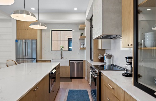 The fully equipped kitchen includes cookware and dinnerware, a refrigerator, dishwasher, oven, induction cooktop/ stove, microwave, blender, toaster, and coffee maker. There are two living areas with ample seating. Additional amenities include a double set of washer and dryer, iron and ironing board, and a starter kit of toiletries and essentials.