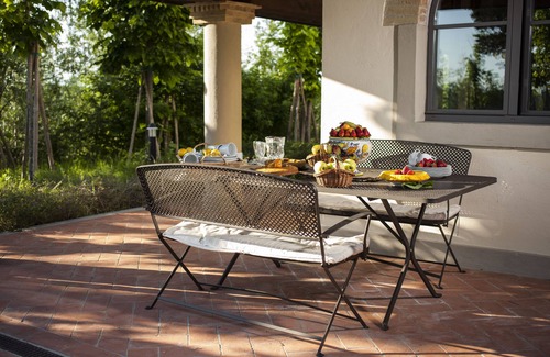 GARDEN & SWIMMING POOL: From its spectacular location perched on top of a hill, Villa Virginia enjoys the most breath-taking views. The French windows at the villa open directly onto the loggia equipped with wrought iron garden furniture completed by cushions.