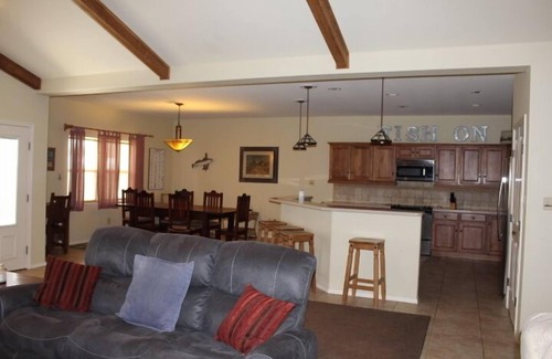 Enhance your stay with the convenience of a private boat slip provided downstairs, perfect for water enthusiasts looking to explore. While fishing lights are not available, the BBQ pit, satellite TV, an ice maker, and a washer/dryer are all at your disposal, ensuring a stay that is as comfortable as it is enjoyable.