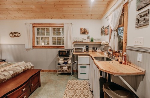 this unique glamping experience. A tastefully furnished and decorated cabin