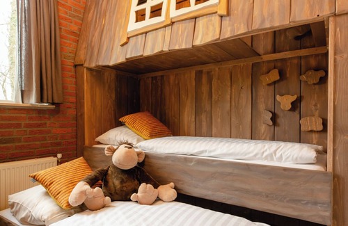 Charming Children's Bungalow in a Rural SettingEnjoy a delightful stay in this farm-themed children's bungalow, perfect for families seeking a child-friendly retreat. Accommodating up to 8 people, this spacious accommodation is set in a peaceful location with views of animals. Designed with both comfort and accessibility in mind, it features a cozy living area, a fully equipped kitchen, and three themed bedrooms. A playground for the little ones is conveniently located nearby.This bungalow is equipped with:Cozy living room and farm-themed bedroomsAdapted facilities for disabled guestsFully equipped kitchen with a microwave, dishwasher, fridge with freezer compartment, stove, and coffee makerCentral heating for year-round comfortThree bedrooms:Master bedroom with a luxurious double bedTwo themed children's roomsBathroom with shower and sinkSeparate toiletFree parking near the bungalowHigh chair availableSelection of family games for fun and entertainmentThis charming bungalow offers the perfect mix of relaxation, adventure, and family-friendly comfort in a beautiful rural setting.