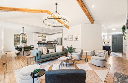 From the moment you step inside Haven in the Hills Asheville, you will feel the warmth and comforts of this modern farmhouse-style home. This professionally designed residence, adorned with carefully curated decor and brand-new furnishings, is nestled just outside Asheville, ensconced in nature within a serene, private neighborhood. The well-equipped kitchen features modern appliances, a thoughtfully appointed coffee/tea bar, and a fully stocked culinary haven for all your cooking and entertaining endeavors. A grill and ample seating options invite you to savor meals indoors or beneath the open sky. This inviting home accommodates diverse sleeping arrangements, with five king beds, one queen bed, and a playful full-size bunk bed for the younger members. A pull-out queen sleeper-sofa in the basement adds versatility, allowing the house to accommodate large gatherings or create an intimate setting for smaller groups. The primary bedroom on the main floor boasts an en-suite bathroom, complemented by an additional full bathroom on the main floor and another full bathroom on the lower level.