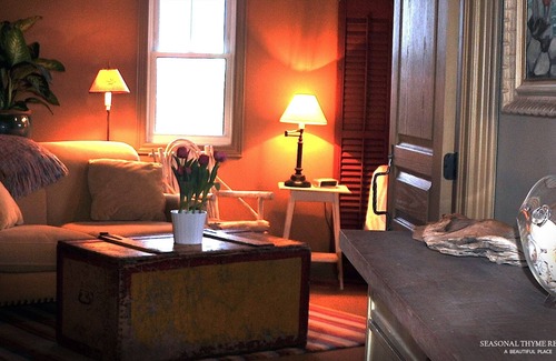 Gracing the natural beauty of it's surroundings is Seasonal Thyme retreat. Welcome! Located in one of Canada's top 10 destinations, Prince Edward County, Seasonal Thyme retreat rests on 3 acres decorated with perennial gardens overlooking Weller's Bay. Our private 2 bedroom unit features 2 floors of spacious living with a large verandah facing the bay. The first floor hosts a sizable bedroom, 3 piece bathroom, kitchen, dining room and living room with a wood burning fireplace. The second floor provides a master bedroom, 4 piece bathroom and tv room. There are vaulted ceilings throughout giving the environment a feeling of endless space.