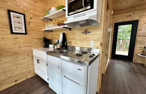 Casa Rio is an open-concept tiny house that sleeps 5 in total(but only four adults). The bed is king-size with a sleeper sofa for the little one. The second bedroom has one queen bed. It has one full bath with a walk-in shower and a small kitchen area with a 2-burner stove top, coffee top, and a microwave. A small sink and small refrigerator. There is a bar to eat at.