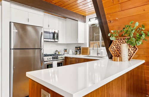 After a trip to the local Farmers Market, come home and whip up delicious home-cooked meals easily and conveniently, with our newly renovated, open kitchen. This modern cabin kitchen boasts pristine white quartz countertops and gorgeous walnut cabinets. It’s equipped with everything you need to feel at home – brand new stainless steel kitchen appliances, including a refrigerator, gas range, microwave, and dishwasher, kid-friendly dishes and cutlery, pour-over drip coffee kettle, automatic coffee machine, and even a rice cooker.