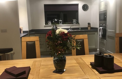 A south facing house with fantastic views across the Galloway country side. The large windows in the living area allow the sun to flood in summer and winter. The living area is open to the apex of the roof adding to the sense of space. A wood burning stove , and underfloor heating powered by an Air source heat pump mean that you will be cosy even on the coldest nights. There is a private patio with a large hot tub, ideal for relaxing and gazing at the stars. Challenge friends and family to a game of table tennis or pool in our adjacent games room. A large lawn will tire out the most energetic youngster. There is a paddock next to the garden where our friendly Shetland ponies Dragon Fly and Bumble Bee hang out, always on the lookout for a carrot ! Threave Gardens, Castle and estate walks are close by. The area has quiet roads to cycle on and hills to ramble on. We are well situated for visiting the main tourist places in Dumfries and Galloway. The market town of Castle Douglas is a 10 minute drive away and the artists town of Kircudbright (new Art Gallery opening early 2018) a 15 minute drive away. You'll be surprised how much the area has to offer.