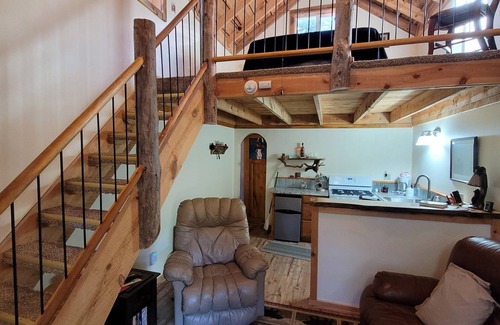 Bill designed and built the cabin which he finished in 2018. The cabin measures 12 × 26 with a 10 x 12 loft, a full bath, kitchen and a queen size bed in the loft (an earlier guest commented that the open stairs are steep). The living room area has a reclining couch and a comfortable recliner. The Samsung smart TV’s reception is by antenna with local channels.