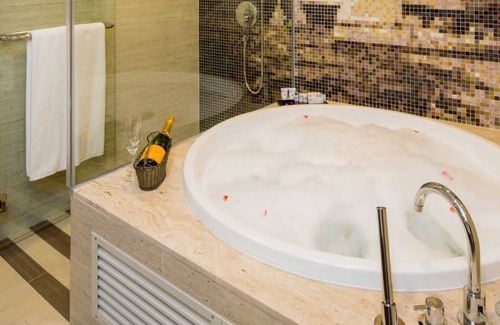 Other amenities include a kitchenette equipped with microwave oven, small refrigerator and a small dining table. Separate shower, a “Jacuzzi” and his/her sinks adorn the spacious bathroom.