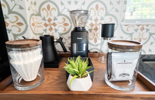 • Appliances include 4-top electric stove and oven, microwave, refrigerator with freezer, pour-over coffee carafe and water kettle, traditional coffee maker, toaster, and blender.