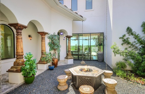 This custom home is a one-of-a-kind property with sweeping canyon views of the back patios and balconies. The home boasts a refined collection of décor that celebrates the world traveler. Enter through the Zen-filled courtyard through the imported doors to find the gourmet kitchen, dining table and living room with floor to ceiling windows. The media room is also in this main house and can be a sleeping area.