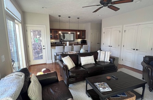 Walk across the street to campus and the stadium. You cannot get closer to the stadium than this condo! This five bedroom, five bathroom condo includes two separate living rooms, a lower level game room, an outdoor deck, garage, wifi and sonos system. This beautiful property boasts 5 bedrooms, including one king bed, two queen beds, two double beds and 2 futons in the lower lever bedroom. You're sure to make fantastic memories with a stay at our place.