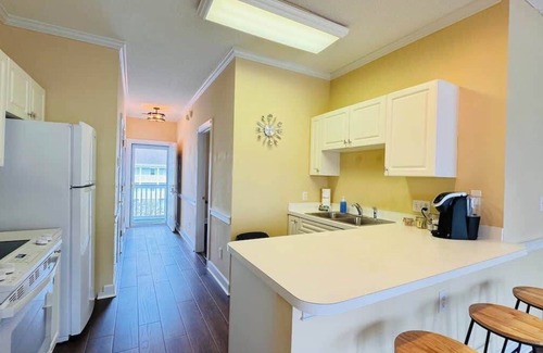 3rd floor, must climb stairs. Beautiful and cozy condo located in the heart of Myrtle Beach, built around the Myrtlewood Golf Club, just off the bypass, minuets from the beach and all main attractions! Kitchen is fully equipped with all basics. Condo sleeps up to 4 guests.