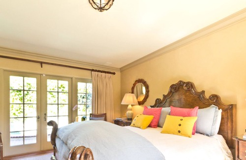 With oak hardwood flooring throughout, the home has 2 bedrooms and two baths. The en-suite Master bedroom with a Queen bed has french doors opening up to two separate private patios, one with a sunken, in ground Jacuzzi/fountain, the other private fenced patio has fruit trees espaliered along the fences and a beautiful covered entertaining area with a top of the line Lynx gas grill. Gorgeous lovingly designed gardens with mature trees and hedges surround the property, helping to keep it private and serene. The nesting birds offer a riot of song in the spring. The second bedroom has two extra long twin beds. There is a formal dining room with custom made dining table that seats 6, and an eat in area in the kitchen with a lovingly restored 1950's Westin Hollywood antique baker's oven that works well!