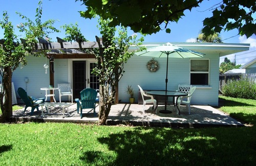 My beach cottage is waiting for you to just relax and enjoy the ambiance of old Florida. Completely renovated and beautifully decorated with a retro Florida and beach feel. The entire home has large porcelain floor tile, for ease of sand clean-up and to accommodate any pets. Many throw rugs have been added for your comfort. Large Master bathroom features a large glass shower enclosure and Bombay chest vanity. Full separate Laundry room off the master bath under air. Romantic master bedroom with luxurious linens on a queen iron bed beside french doors that leads to a Paver patio with pergola in a privately fenced yard. Both bedrooms have a mounted flat screen cable TV. The second bedroom also has a queen iron bed with beachy colors and white beadboard walls, with a larger closet to store your things. The hallway bathroom features a pottery barn look with white subway tile, tub and shower and all new vanity, cubbies with baskets, fresh fluffy towels. Large mosaic mirror with lighting in hallway for additional vanity room. Lots of wall hooks for drying damp towels and swim suits. The dining/den area has an exterior door that leads to the side &/or back patio. This room also has a large buffet unit that was custom built to become a twin size Murphy bed. A clock radio with CD player and a small hutch for holding card games and beverage mixers is available. A bar height table and chairs (seats 2-4) are also in this room. The living room has a queen size pull out sofa and also has a large flat screen HDTV and DVD player. We also have books and DVDs available in the living room area for an occasional rainy day. The kitchen is all new with stainless steel appliances, granite countertops and a Kuerig coffee maker. Large breakfast bar that seats four. WIFI is available for your laptop or smart phone and an alarm system has been installed on the property.