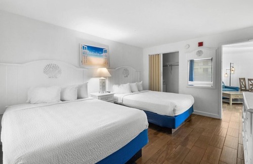 This angle ocean view suite features 2 queen beds, a murphy bed, sofa, living room, dining area, kitchen, bathroom, and private balcony. These rooms are on higher floors starting on 11th up to the 15th floor. The angle ocean view is a north or south facing unit where the ocean will be to your left or right when standing on the balcony. You will have a coastline view of the beach as well as surrounding hotels and residential areas with view of the city lights at night. The rooms are 575sq feet. All suites and balconies are non-smoking.