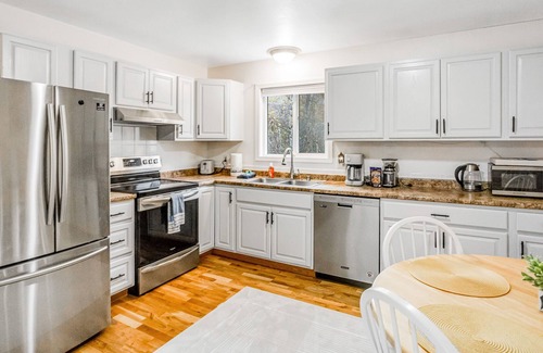 Inside, get comfortable amongst plush furnishings and updated amenities. The living room's sofa and Smart TV are ideal for streaming sessions, but when you aren't feeling a movie, engage in some playful competition over a game of cards. When you get hungry, the full kitchen offers stainless steel appliances and ample meal prep space.