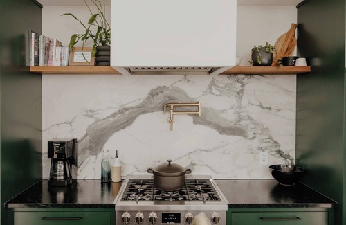 The space is elegantly furnished with a wooden dining table and matching chairs, plush seating around a stylish black and white swirl marble coffee table facing a cozy woodstove. The forest green and black kitchen contrasts beautifully against the crisp white background boasting graceful pendant light fixtures, marble countertops and an artistic backsplash that adds a unique touch of character.