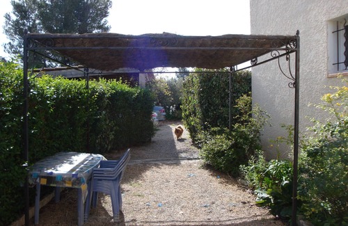 In Provence, in Eyragues, 7 km Saint Rémy de Provence, 15 km Avignon, near Camargue, rent apartment in villa, possibility of 3 to 4 people, equipped kitchen, two bedrooms, overlooking a landscaped garden with swimming pool, view on the Alpilles; swimming pool, bowling green, ping pong table, air conditioning