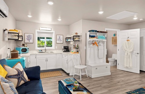 With Airconditioning, after your long day of adventure, nice and cool cozy getaway awaits in Keaau Kaloli Point a Micro climate of sun, at this amazing Detached STUDIO. A detached Studio from Main House. Equipped with essential amenities like WiFi, AC, and a COUCH/Pull Out Bed, this welcoming space is perfect for guests looking for a serene retreat. Whether you're exploring the island or simply relaxing indoors, this studio provides the perfect base for your adventures. NEXT to Shipman Beach Trailhead. GATED with a remote control for your vehicle. We have a PRIVATE WELL WATER! We look forward to hosting you at our place.