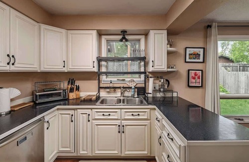 With three bedrooms — including a master with a queen bed, a queen guest room, and a fun kids’ bunk room with a slide — everyone will find their perfect spot to relax. After a day of exploring Anchorage, unwind in the private hot tub or enjoy the fenced backyard.