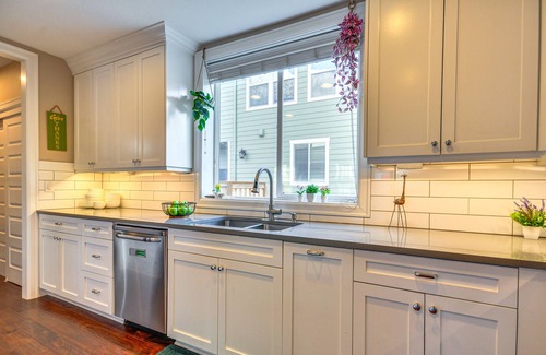 KITCHEN: Dishwasher, stove/oven, refrigerator, microwave, Keurig coffee maker w/ reusable K-cup, dishware + flatware, cooking basics, trash bags + paper towels