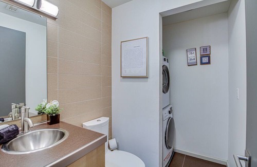 GENERAL: Linens/towels, in-unit washer/dryer, central A/C & heating, hair dryer, hangers, iron/board, complimentary toiletries