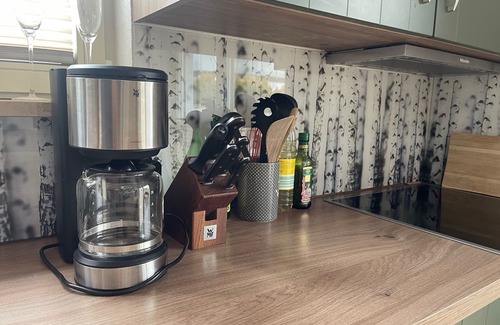 a refrigerator with freezer compartment, a ceramic stove, oven, dishwasher, coffee machines (nespresso & regular) and of course plates, dishes and many kitchen utensils.